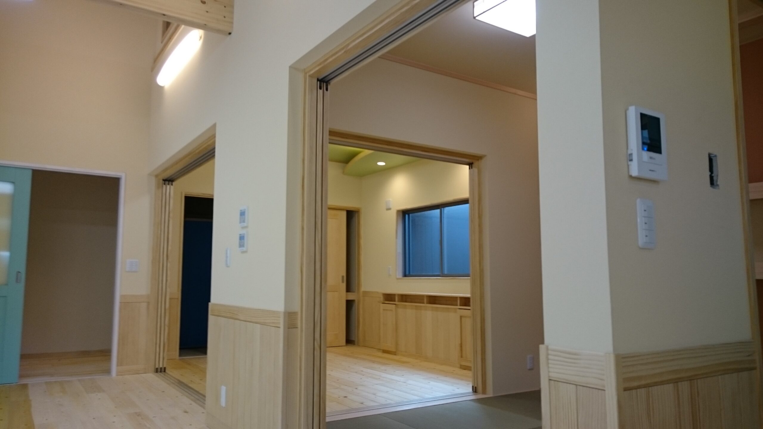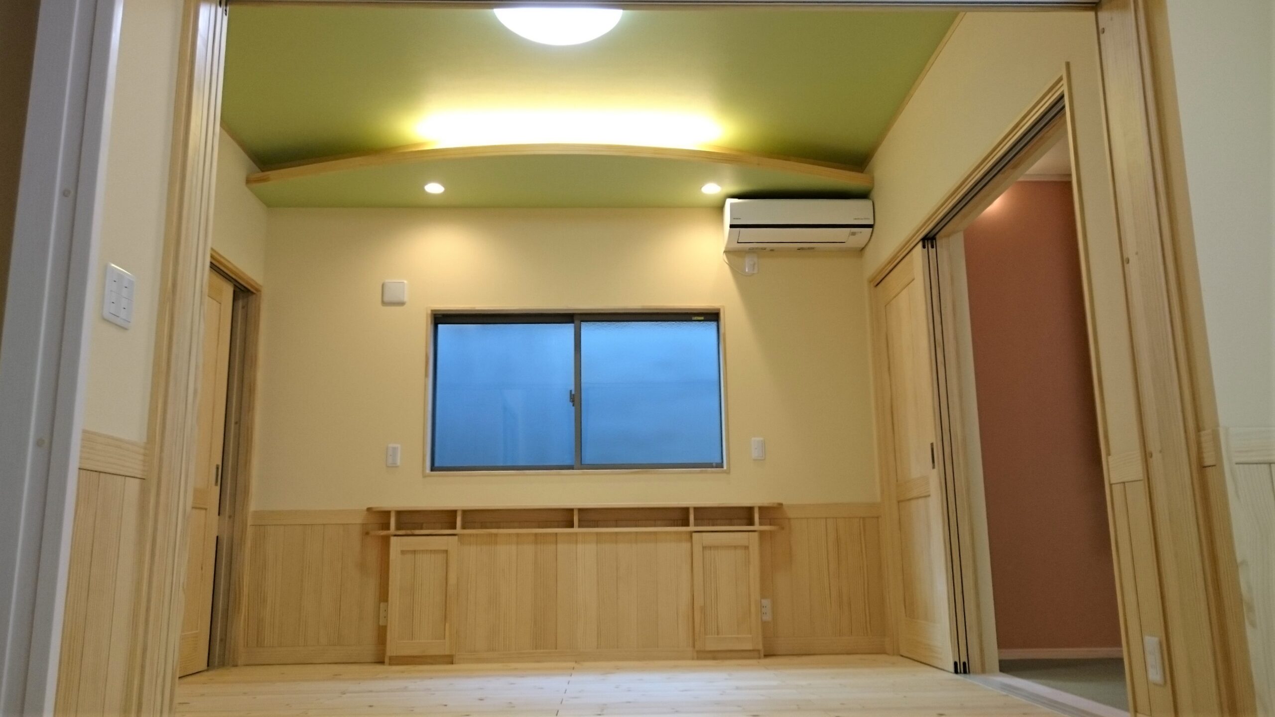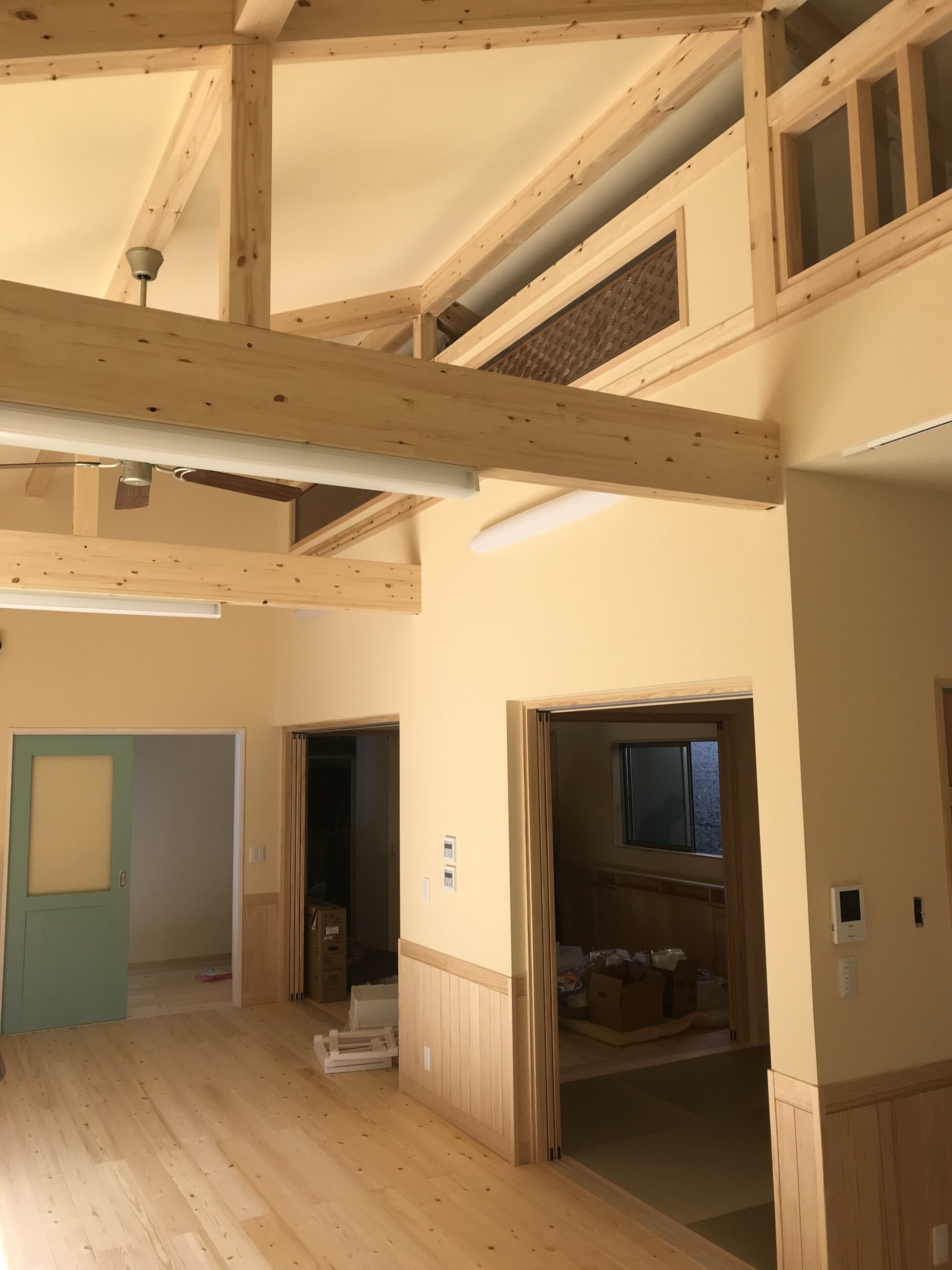 木に包まれて暮らせるよう梁を表しにするのはもちろん、腰壁を付けました。