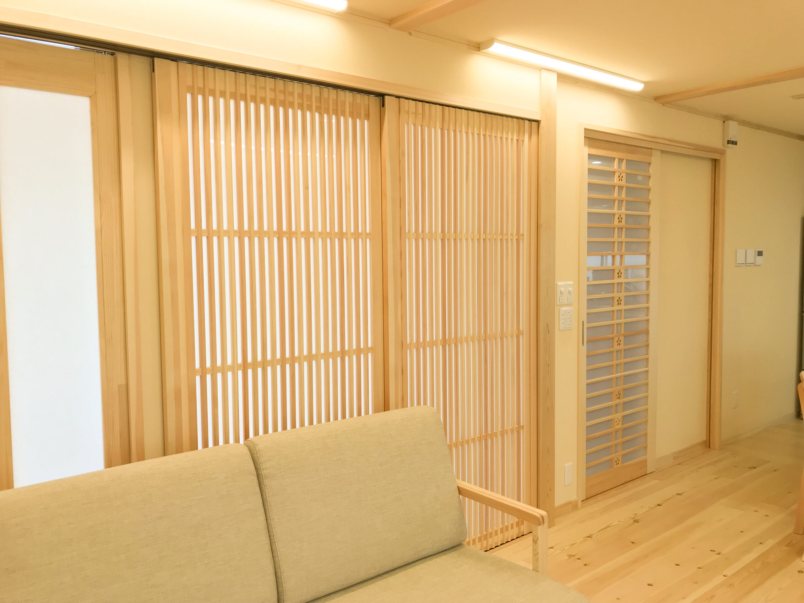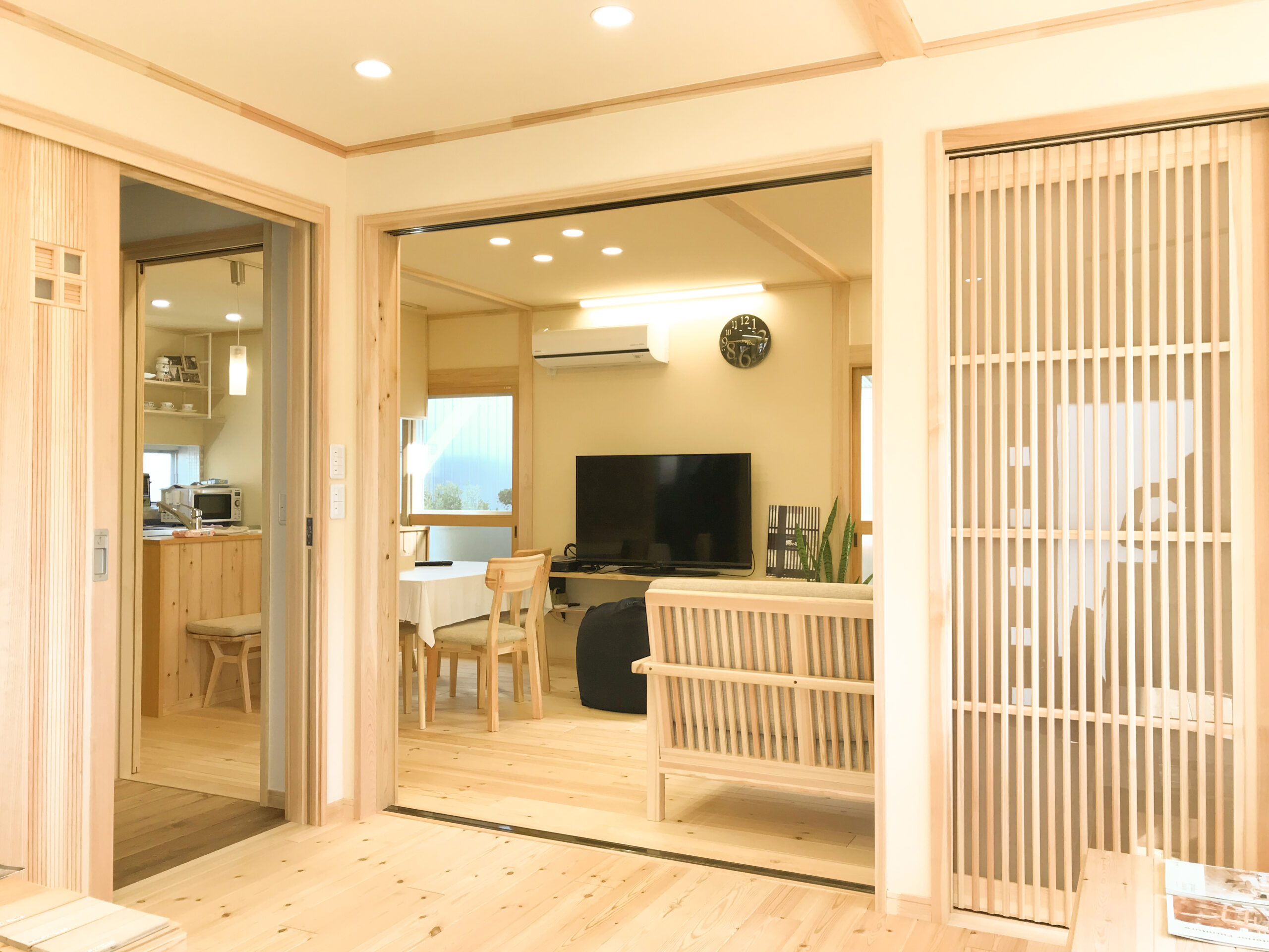 珪藻土クロスに無垢材の床、木目の美しい建具。